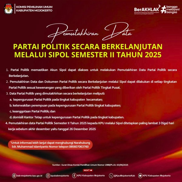 KPU Kabupaten Mojokerto kali ini menginformasikan kalau Partai Politik dapat melakukan Pemutakhiran Data Partai Politik secara berkelanjutan melalui SIPOL Semester II Tahun 2025 lho!!